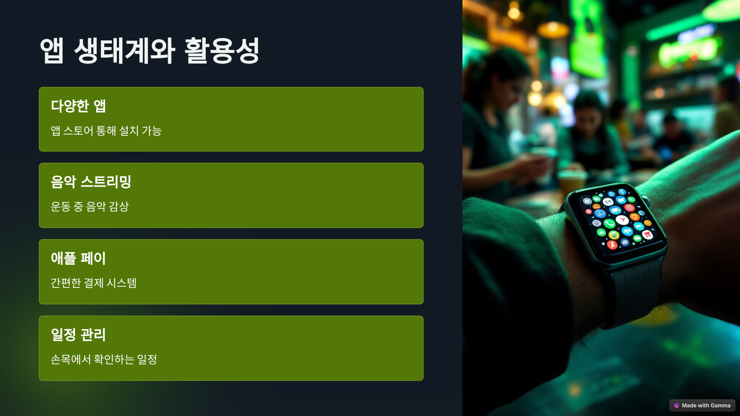 앱 스토어를 통해 다양한 앱을 설치할 수 있어 활용도가 높습니다. 음악 스트리밍, 날씨 확인, 일정 관리 등 일상생활에서 유용하게 사용할 수 있는 기능들이 많아요. 특히, 애플 페이를 통한 간편 결제는 정말 편리합니다. 💳