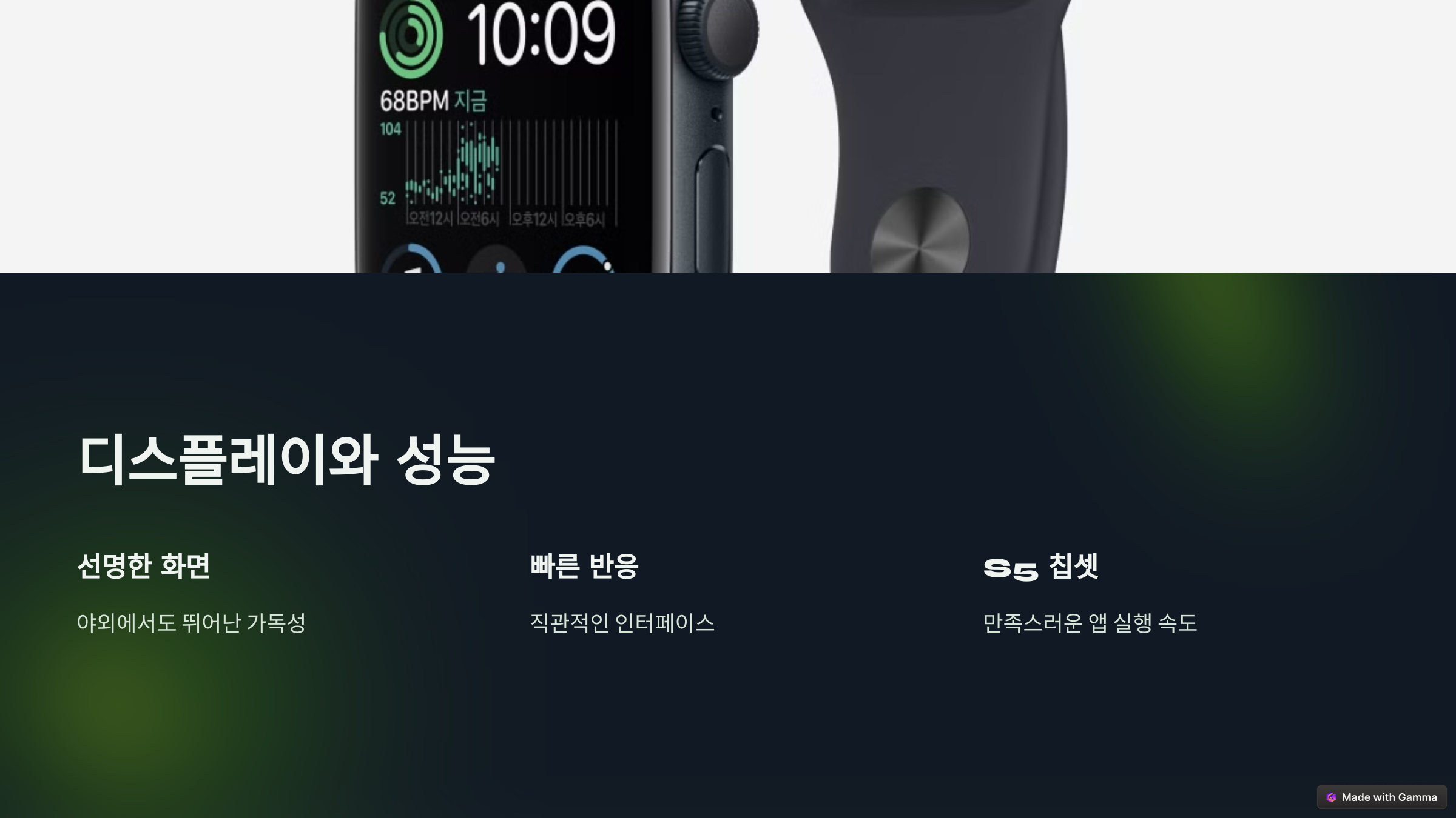 선명한 Retina 디스플레이는 야외에서도 가독성이 뛰어납니다. 터치 반응 속도도 빠르고, 인터페이스는 직관적이어서 처음 사용하는 분들도 쉽게 적응할 수 있을 것 같아요. 다만, 항상 켜져 있는 디스플레이(AOD) 기능이 없다는 점은 아쉽습니다. 😕